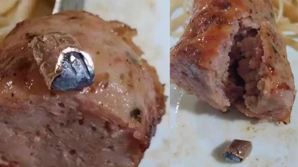 Si bien al principio el hombre pensó que se trataba de algún material que había quedado en el chorizo tras ser procesado en la picadora, todo se volvió más dramático cuando miró de cerca lo que era: había una bala en su interior. “De suerte nada más no lo tragué”, dijo el padre de familia ante la FM Aire Libre sobre el proyectil que extrajo de su boca.