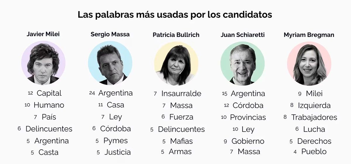 En una retórica moderada, más irónica que de volumen alto, el candidato de La Libertad Avanza, Javier Milei, también hizo especial hincapié en determinados términos como “Capital”, “Humano”, “Casta”, “País”, “Delincuentes” y “Argentina”.
