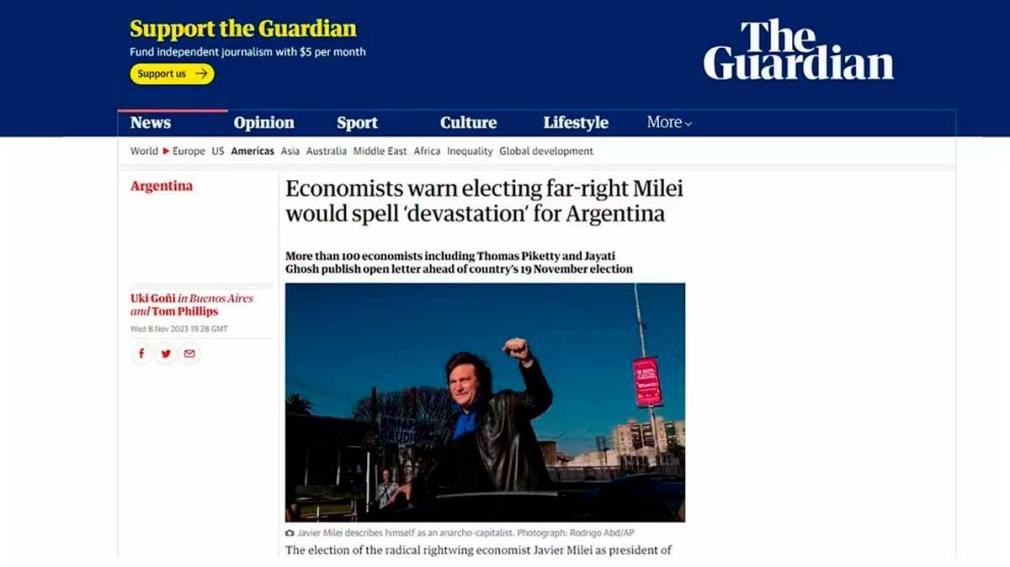 Un grupo de más de un centenar de economistas de todo el mundo publicó una carta abierta con fuertes cuestionamientos al candidato de La Libertad Avanza (LLA) Javier Milei, sobre quién consideraron que podría provocar “más devastación en el corto plazo” y “caos social” en caso de ser electo presidente el próximo 19 de noviembre, según publicó el diario inglés The Guardian.