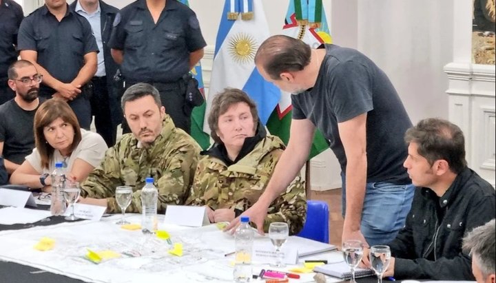 La comitiva la integran, además del jefe de Estado, Guillermo Francos (ministro del Interior) Patricia Bullrich (ministra de Seguridad); Sandra Pettovello (ministra de Capital Humano); Luis Petri (ministro de Defensa); y la secretaria General de la Presidencia, Karina Milei.