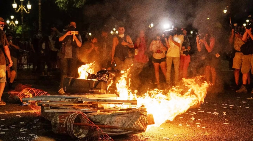 Más tarde, los manifestantes rompieron las baldosas de la Plaza Congreso para arrojar cascotes a los efectivos policiales. Además, prendieron fuego varios contenedores de basura y colchones que pertenecían a personas en situación de calle. Los bomberos de la Ciudad tuvieron que intervenir para extinguir las llamas.