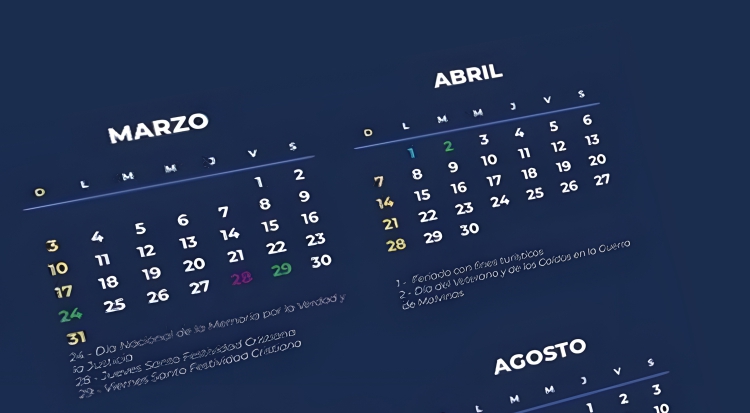Los días festivos correspondientes a Semana Santa este año son el 28 de marzo (Jueves Santo, no laborable), 29 de marzo (Viernes Santo, feriado), 30 de marzo (Sábado Santo), 31 de marzo (Domingo de Pascua), 1 de abril (feriado puente turístico) y 2 de abril (Día del Veterano y de los Caídos en la Guerra de Malvinas, feriado).