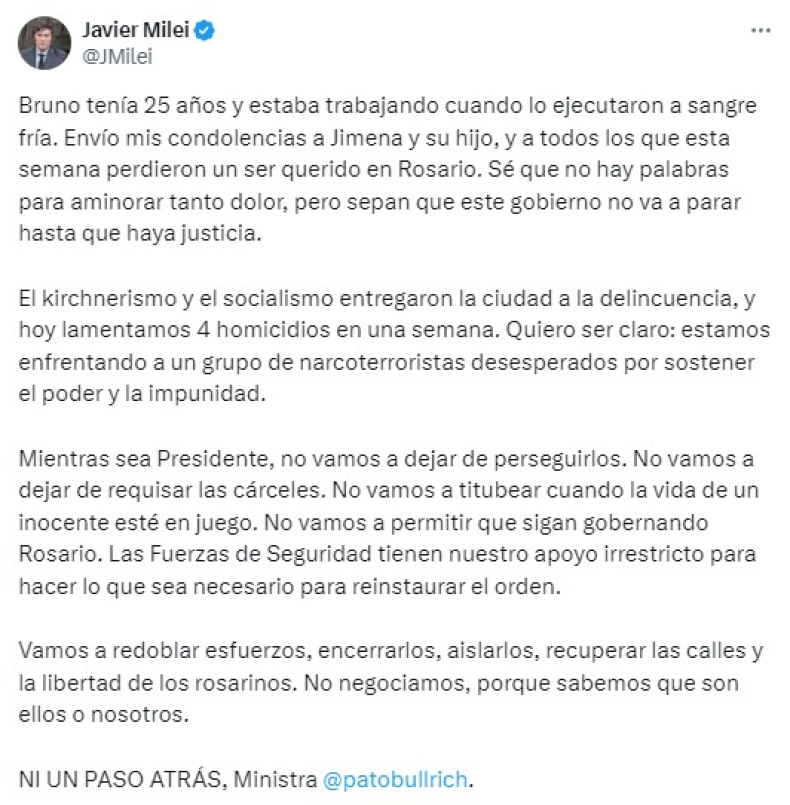 Para finalizar, Milei llamó a "redoblar esfuerzos, encerrarlos, aislarlos, recuperar las calles y la libertad de los rosarinos. No negociamos, porque sabemos que son ellos o nosotros. Ni un paso atrás, ministra Patricia Bullrich".