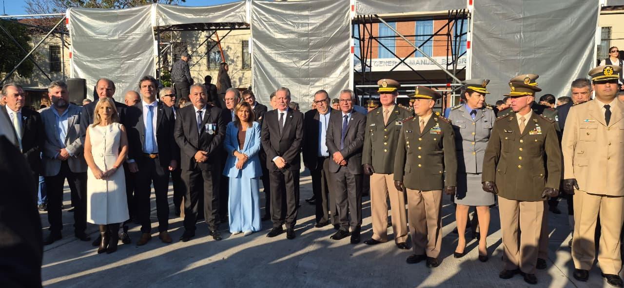 El homenaje arrancó con el tradicional izamiento de las banderas nacional y provincial, un momento de profunda solemnidad que estuvo encabezado por el Gobernador de la Provincia, Elias Suárez y la intendenta de la Capital, Ing. Norma Fuentes.