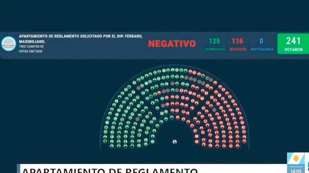 La votación arrojó 125 votos positivos y 116 negativos, pero como los expedientes no tenían dictamen se hubiera requerido una mayoría agravada de las tres cuartas partes de los diputados presentes.