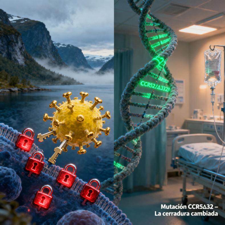 El VIH utiliza un receptor llamado CCR5 para invadir los linfocitos T CD4, las células centrales del sistema inmunitario. La mutación CCR5Δ32 bloquea ese receptor: es como si el VIH llegara a la puerta de una casa y descubriera que la cerradura ha sido cambiada. Sin esa llave, el virus no puede entrar ni replicarse.