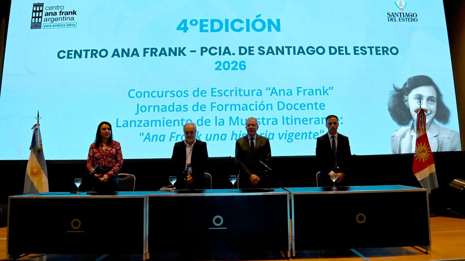 El gobernador Elías Suárez participó este martes por la mañana el acto de lanzamiento y capacitación docente de la 4° edición del Concurso de Escritura “Ana Frank una historia vigente”, que se desarrolló en el Centro de Convenciones Fórum, donde estuvo acompañando por el jefe de Gabinete, Víctor Araujo; la ministra de Educación, Mariela Nassif, y el director del Centro Ana Frank en Argentina, Héctor Shalom, entre otras autoridades e invitados.