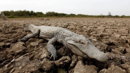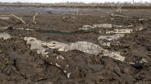 Tiempo de lectura: 2 minutos, 15 segundosCientos de caimanes muertos yacen en el lecho seco del río Pilcomayo, en Paraguay. Algunos murieron de hambre y sed, otros que aún están vivos se hunden en el barro para evitar los ataques de buitres.